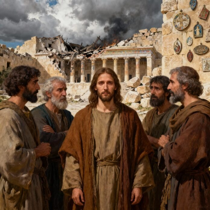 Das Lukasevangelium wurde wahrscheinlich geschrieben Nach das Jahr 70 n. Chr. Nach Die tatsächliche Zerstörung des Tempels durch die römischen Armeen. Lukas' Gemeinde interpretiert dies daher nicht als zukünftige Vorhersage, sondern als Deutung eines erlebten Traumas. Bereits gelebte Erfahrung. Die Frage lautet nicht mehr «Wird es passieren?», sondern «Wie soll man damit leben?“ JETZT »Was ist geschehen?“ Wie können wir weiterhin glauben, hoffen und als Jünger leben, wenn das heiligste Symbol unseres Glaubens zu Asche verbrannt ist? In diesem Kontext von posttraumatischem Stress und Ungewissheit gewinnt Jesu Antwort ihre volle Bedeutung. Er gibt ihnen keinen Zeitplan, sondern einen Kompass für ihre Herzen.