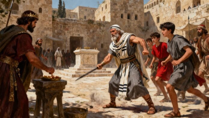 Die Passage in 1 Makkabäer 2,15–29 fällt in die tragische Zeit der Seleukidenherrschaft im 2. Jahrhundert v. Chr. König Antiochos IV. Epiphanes versuchte, die Juden zum Abfall vom Glauben zu verleiten, indem er sie zu Opfern an die griechisch-syrischen Götter zwang – ein Symbol der Unterwerfung unter die Fremdherrschaft und ein radikaler Bruch mit dem Bund zwischen Gott und Israel. Die Szene spielt in Modin, einer Stadt, in der königliche Gesandte versuchen, Mattathias, einen angesehenen Anführer, zur Durchführung des Götzenopfers zu bewegen. Frieden und Ehren. Doch Mattathias weist diese ausgestreckte Hand entschieden zurück und verkündet lautstark: «Wir werden dem Bund unserer Väter folgen», und weigert sich, vom Gesetz abzuweichen, selbst auf die Gefahr hin, den Tod zu erleiden.