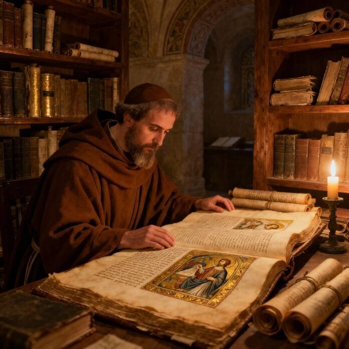 במעמקי ספרייה מנזרית דוממים, נזיר מהמאה הרביעית מגלה שכבות של משמעות בפסוק מקראי יחיד שישנה את הבנתו הרוחנית לנצח. בינתיים, באוניברסיטאות שלנו בת זמננו, אותו פסוק מנותח בדיוק כמו אזמל, וחושף את הקשרו ההיסטורי אך לעתים קרובות משאיר את נשמת הקורא ללא שינוי.