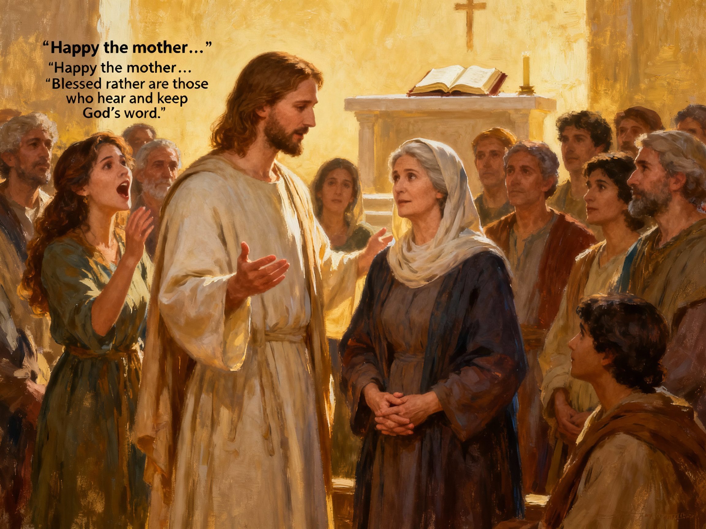 Jésus, en répondant à l’acclamation de la foule, recentre la béatitude sur l’écoute et la fidélité à la Parole. Ce message est pour aujourd’hui : il nous interpelle à faire de la Parole non un ornement de notre vie spirituelle, mais sa source et son critère. Marie demeure notre modèle : elle est la première et la parfaite auditrice, mais sa maternité n’annule pas l’appel universel à l’écoute — elle l’incarne.