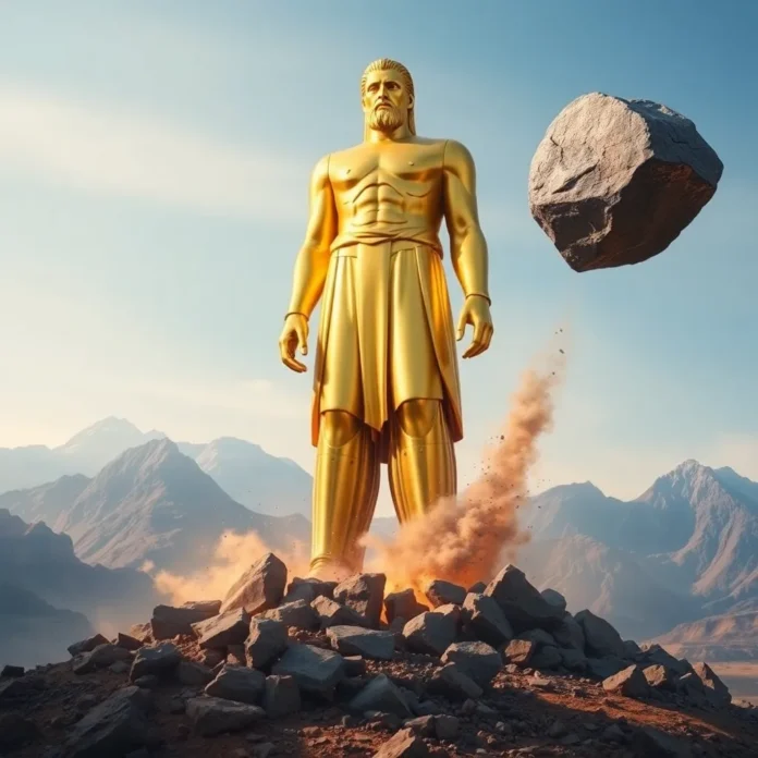 Mentre il re contempla la statua, una pietra si stacca da una montagna, "senza che nessuno l'abbia toccata". Questo dettaglio è cruciale: questa pietra non è opera degli uomini, né il risultato di una strategia politica o militare. Viene da altrove, da Dio, ed emerge nella storia senza passare attraverso i normali meccanismi del potere. Colpisce i piedi della statua, quel punto di convergenza tra la forza del ferro e la debolezza dell'argilla, e ne polverizza l'intera struttura. Ferro, argilla, bronzo, argento e oro vengono spazzati via come una palla trasportata dal vento: non rimane traccia di questi regni presumibilmente eterni.