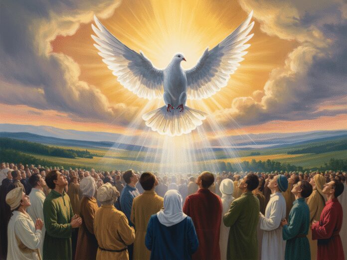Jésus promet également l’envoi du Saint-Esprit : « Vous recevrez une puissance, le Saint-Esprit survenant sur vous, et vous serez mes témoins » (Actes 1:8). Cette promesse s’accomplit dix jours plus tard, le jour de la Pentecôte, lorsque l’Esprit Saint descend sur les disciples réunis au Cénacle. Le récit d’Actes 2 décrit des langues de feu qui se posent sur chacun et leur permettent de parler en d’autres langues, signe que l’Évangile est pour tous les peuples.
