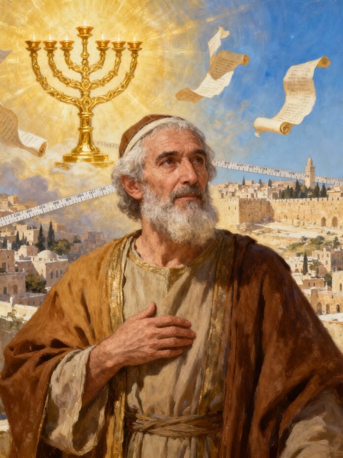 4.1-14 5° Dans la cinquième vision, chap. 4, Dieu montre au prophète un candélabre d’or, placé entre deux oliviers ; le candélabre et les oliviers sont l’emblème du temple qui sera achevé par Zorobabel et enrichi de tous les dons du Saint-Esprit.
