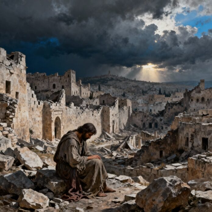 Gdy lud izraelski został wzięty do niewoli, a Jerozolima została spustoszona, prorok Jeremiasz usiadł i płacząc, wygłosił tę lamentację nad Jerozolimą; wzdychał w goryczy swego serca i wołał, mówiąc: