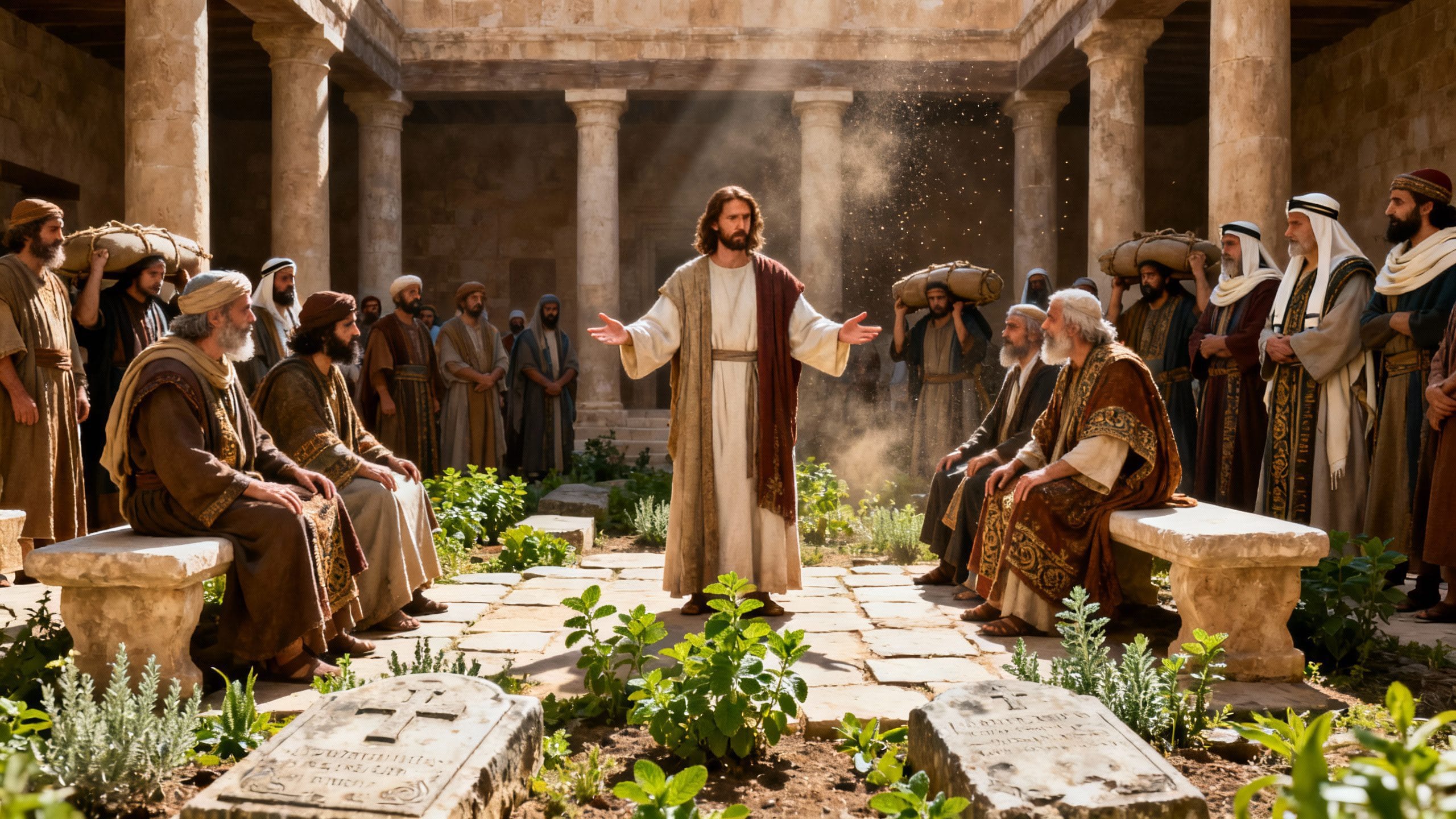 A passagem de Lucas 11:42-46 está no cerne de uma controvérsia entre Jesus e certos fariseus e doutores da Lei. A censura não se dirige à observância em si, mas ao seu desequilíbrio: escrupulosa quanto ao dízimo da hortelã e da arruda, negligente quanto ao "juízo e amor de Deus". Essa tensão revela uma mudança sutil: quando a prática, mesmo meticulosa, se desvia de seu propósito, torna-se um fardo inútil e uma barreira à misericórdia.