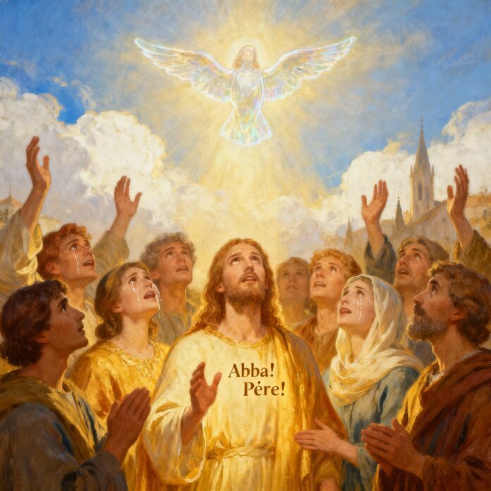 L’Esprit d’adoption transforme cette dynamique. Il produit en nous la capacité de dire « Abba », ce mot que seul Jésus prononçait avec cette simplicité confiante. Nous ne nous approprions pas un titre qui nous serait étranger, mais l’Esprit nous fait participer à la relation même que le Fils entretient avec le Père. C’est lui qui crie en nous, par nous, à travers nous.
