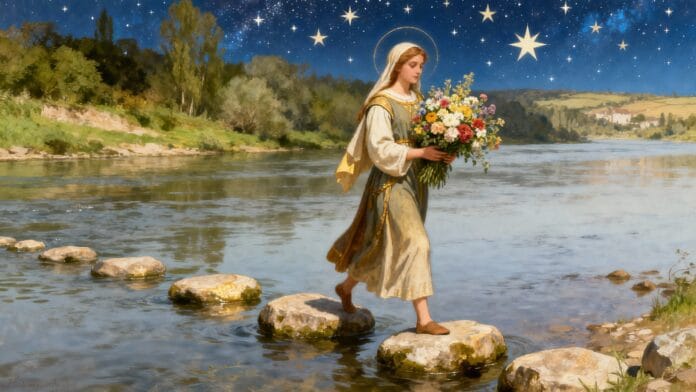 这个奇迹的另一个版本将圣女与当地居民的实际需求联系起来。当她行走在水面上时,奇迹般地在她面前出现了大石头。这些石头被用作界碑,划分了邻近地主的田地,从而结束了无休止的邻里纠纷。.